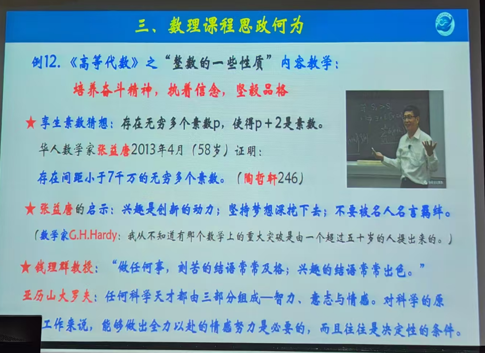 王尧教授结合具体案例,分享了如何在数学、物理教学中融入思政元素,使学生的学习不仅停留在知识的接受上,更要培养学生独立思考和解决问题的能力。他用如盐入水、润物无声的生动比喻,形象说明了教学过程中如何将课程内容与思政元素进行融合,使得教学生动而富有成效。