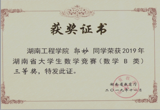 为了多锻炼自己,我也积极参加学科竞赛,学院每年都会组织一次数学学科竞赛,我记得第一次是因为我的不认真和自以为掌握牢固的基础知识在校赛就落榜了,第二年凭借着第一年的教训,勉强挤进了省赛的队伍,学院还专门组织有针对省赛的培训课程,那一个月的培训课程难度比平时课上内容又提升了好几个档次,短期培训确实收效甚微,自然而然的在省赛落榜而归,但也正是通过这次的省赛培训,才让我进一步坚定了深造的念头,数学这门学科学的远不止课本上的东西,自己确实还有很多需要提升的地方,所以在大四,我加入了考研大军的队伍,而目标便是湖南师范大学的数学系,扎实的基础和专业课的强化让我有种脱胎换骨的感觉,在接近最后的考研的日子里,我再一次参加了省赛,这次是幸运也有努力终于夺得了湖南省大学生数学竞赛三等奖的成绩,而考研初试也取得了403分的好成绩,最终被湖南师范大学录取。
