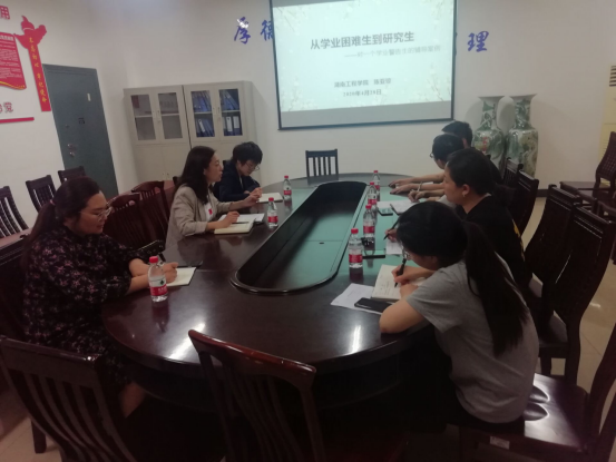 陈亚琼首先作了《从学业困难生到研究生——对一个学业警告学生的辅导案例》分享,她详细介绍了运用介入性谈话、叙事疗法等辅导方式让一名在受学业警告的学生成长到研究生的历程。她指出学生成长过程中,辅导员应该耐心细致地帮助学生做好生涯规划,正确引导学生培养学习兴趣。计算机与通信学院党总支副书记王宁从此案例出发,指出学生网络游戏成瘾是导致部分学生学习困难的因素,作为辅导员要以饱满的工作激情关心学生,助力学生成长。他还特别强调辅导员之间应该加强学院之间的交流和合作,从而达到1+1〉2的效果。之后,与会辅导员就全国辅导员培训学习和如何开展学生思政教育工作展开了热烈的讨论。两个学院的学办主任张利芝和刘洁还为新进的辅导员分享了如何在工作中将实践经验转换成理论成果。