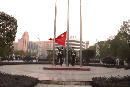 当清晨的第一束阳光照射在知行广场上,国旗护卫队迈着铿锵有力的步伐,护卫着鲜艳的五星红旗冉冉升起,全体师生肃然起敬。