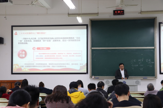 党总支部书记胡武平为全院师生党员上了一堂题为“关于《中国共产党章程(修正案)》修改内容解读”的微党课。