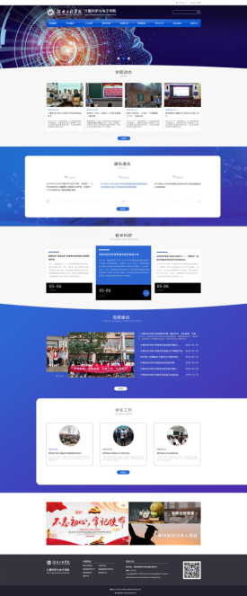 版块底部叠加背景色块的设计,视觉上更加简约,采用左右箭头点击滚动操作,提升了用户体验好感度。教学科研版块采用左右滚动最新新闻卡片设计,突出交互效果,使页面看起来更加生动。党群建设和学生工作版块利用渐变色块和圆角矩形的颜色对比,将两大版块分隔的同时又大量提升了页面的美观度,使页面看起来更柔和。