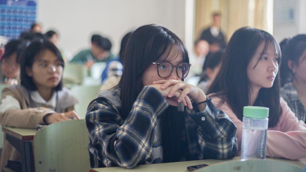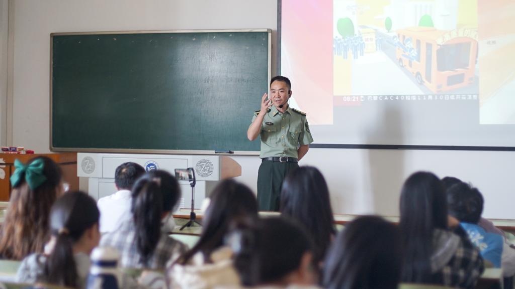刘宸均向同学们展示了当前我国航天科技、军事技术和国防力量等方面的突出成就。随后,引入“大学生高质量就业是什么,与我有什么关系,我要如何实现呢?”“人生的价值到底是什么,我要如何去体现?”“我到底能给国家和社会做些什么?”三个问题,让同学们带着问题边听边思考。他向同学们讲述了当代优秀大学生入伍以后在部队的发展情况,并着重介绍了 a片