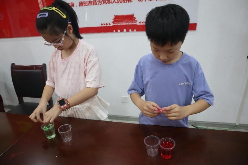 实践团成员与小朋友们并肩作战,共同完成了虹吸实验,见证了水从满水容器沿着长管流向空容器的奇妙过程,让小朋友们亲身体验到了物理实验的乐趣。