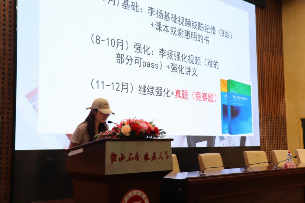 在由学院辅导员徐文娟主持的考研分享会上,周峰峰、石雪、秦雯、覃添和刘洋五位同学作为考取研究生的代表,分别从院校选择、复习规划、专业备考、专业调剂等方面分享了自己的考研经历。统计学1801班秦雯分享中表示“负重前行需要保持情绪稳定、持之以恒的信心。”“考研是场孤独的旅行,每天早上叫醒自己的不是闹钟,而是心中的向往!”信科1801班刘洋鼓励学弟学妹坚定信心,努力备考。